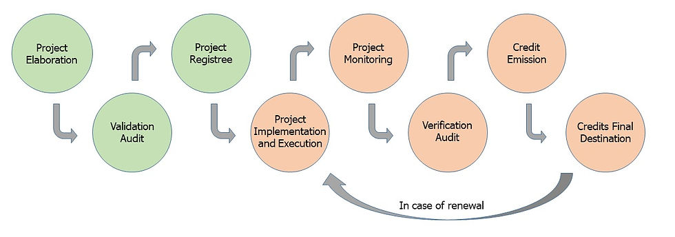 Adapted from ICC Brasil e WayCarbon. Oportunidades para o Brasil em Mercados de Carbono. Relatório 2022. * The processes that only need to happen once are represented in green while the processes that must be repeated in project renewal are represented in orange.